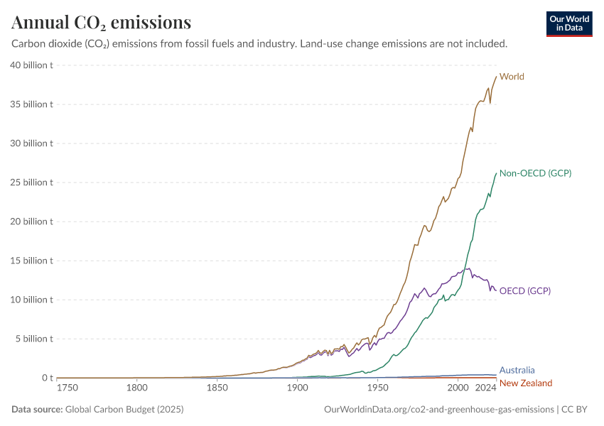“Data Page: Annual CO₂ emissions”, part of the following publication: Hannah Ritchie, Pablo Rosado, and Max Roser (2023) - “CO₂ and Greenhouse Gas Emissions”. Data adapted from Global Carbon Project. Retrieved from https://archive.ourworldindata.org/20251204-133459/grapher/annual-co2-emissions-per-country.html [online resource] (archived on December 4, 2025).