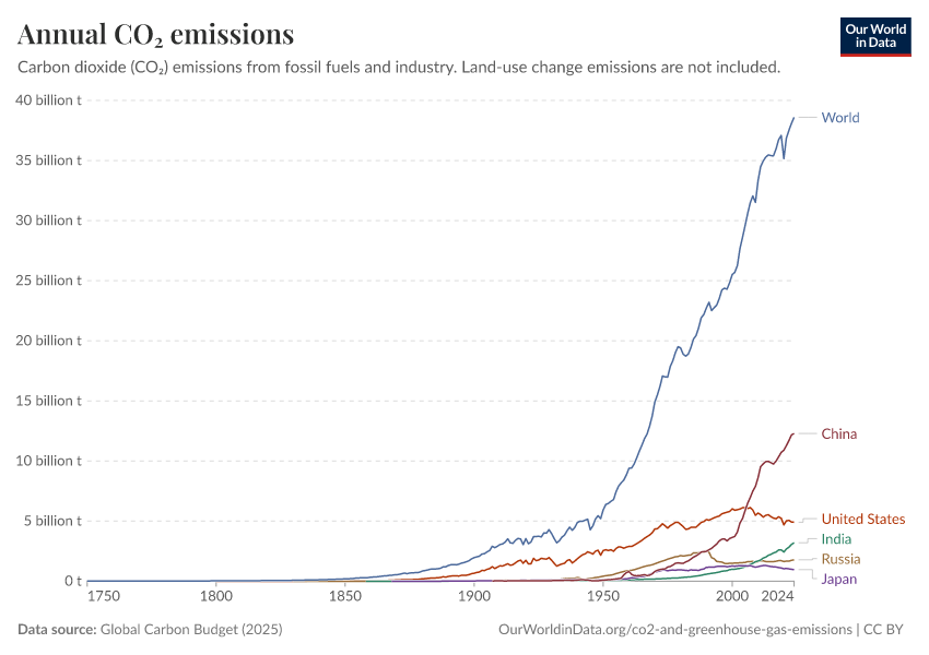 Global Carbon Budget (2025) – with major processing by Our World in Data. “Annual CO₂ emissions” [dataset]. Global Carbon Project, “Global Carbon Budget v15” [original data]. Retrieved January 20, 2026 from https://archive.ourworldindata.org/20260119-070102/grapher/annual-co2-emissions-per-country.html (archived on January 19, 2026).