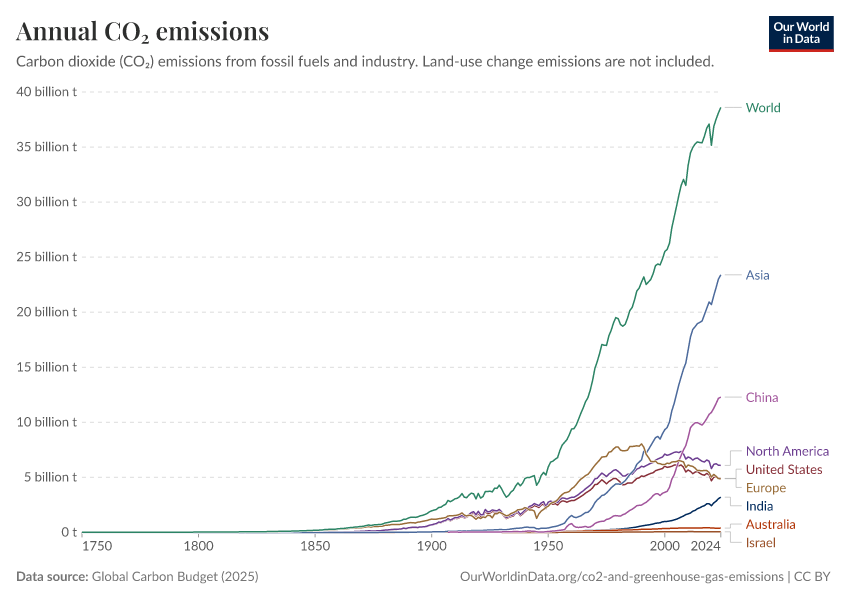 Global Carbon Budget (2025) – with major processing by Our World in Data. “Annual CO₂ emissions” [dataset]. Global Carbon Project, “Global Carbon Budget v15” [original data]. Retrieved January 31, 2026 from https://archive.ourworldindata.org/20260119-070102/grapher/annual-co2-emissions-per-country.html (archived on January 19, 2026).