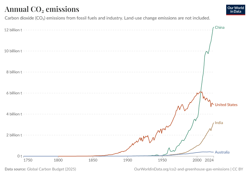 Global Carbon Budget (2025) – with major processing by Our World in Data. “Annual CO₂ emissions” [dataset]. Global Carbon Project, “Global Carbon Budget v15” [original data]. Retrieved December 11, 2025 from https://archive.ourworldindata.org/20251204-133459/grapher/annual-co2-emissions-per-country.html (archived on December 4, 2025).