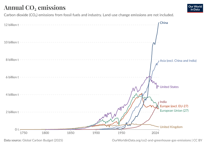 Global Carbon Budget (2025) – with major processing by Our World in Data. “Annual CO₂ emissions” [dataset]. Global Carbon Project, “Global Carbon Budget v15” [original data]. Retrieved April 26, 2026 from https://archive.ourworldindata.org/20260417-112857/grapher/annual-co2-emissions-per-country.html (archived on April 17, 2026).Download