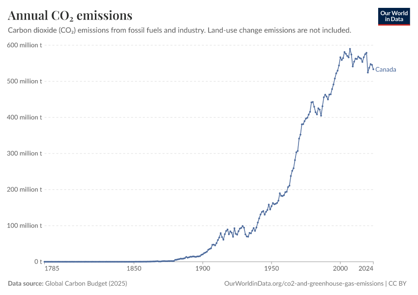 • This data is based on territorial emissions, meaning the emissions produced within a country's borders, but not those from imported goods. For example, emissions from imported steel are counted in the country where the steel is produced. To learn more and look at emissions adjusted for trade, read our article: How do CO₂ emissions compare when we adjust for trade?