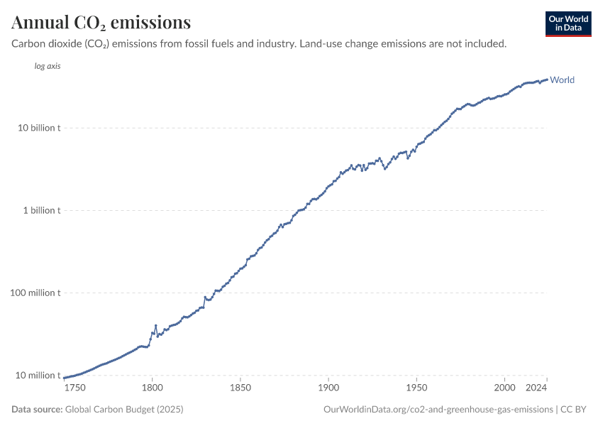 Global Carbon Budget (2025) – with major processing by Our World in Data. “Annual CO₂ emissions” [dataset]. Global Carbon Project, “Global Carbon Budget v15” [original data]. Retrieved January 2, 2026 from https://archive.ourworldindata.org/20251204-133459/grapher/annual-co2-emissions-per-country.html (archived on December 4, 2025).