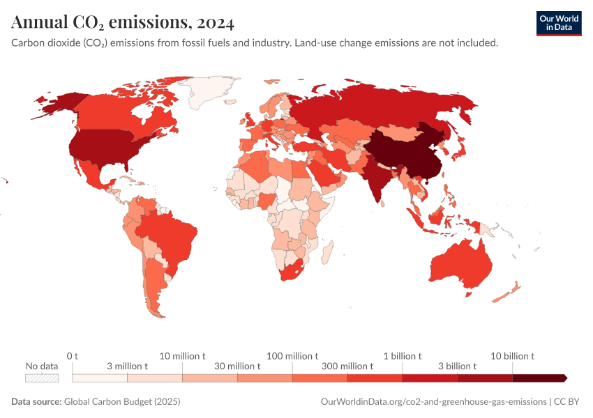 “Data Page: Annual CO₂ emissions”, part of the following publication: Hannah Ritchie, Pablo Rosado, and Max Roser (2023) - “CO₂ and Greenhouse Gas Emissions”. Data adapted from Global Carbon Project. Retrieved from https://archive.ourworldindata.org/20260417-112857/grapher/annual-co2-emissions-per-country.html [online resource] (archived on April 17, 2026).How to cite this data