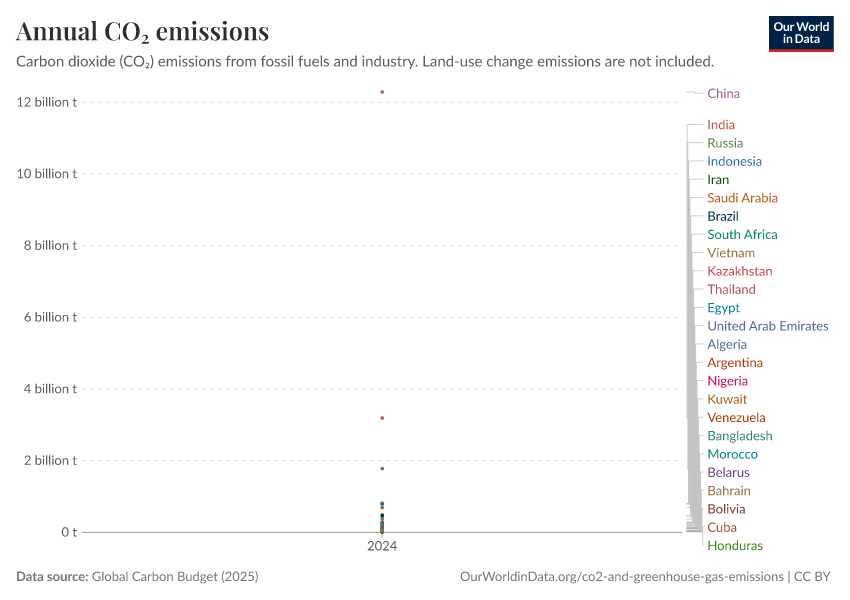 “Data Page: Annual CO₂ emissions”, part of the following publication: Hannah Ritchie, Pablo Rosado, and Max Roser (2023) - “CO₂ and Greenhouse Gas Emissions”. Data adapted from Global Carbon Project. Retrieved from https://archive.ourworldindata.org/20260119-070102/grapher/annual-co2-emissions-per-country.html [online resource] (archived on January 19, 2026).How to cite this data