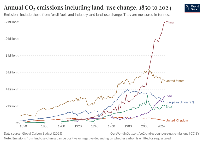 Global Carbon Budget (2025) – with major processing by Our World in Data. “Annual CO₂ emissions including land-use change” [dataset]. Global Carbon Project, “Global Carbon Budget v15” [original data]. Retrieved March 2, 2026 from https://archive.ourworldindata.org/20260223-071105/grapher/annual-co2-including-land-use.html (archived on February 23, 2026).