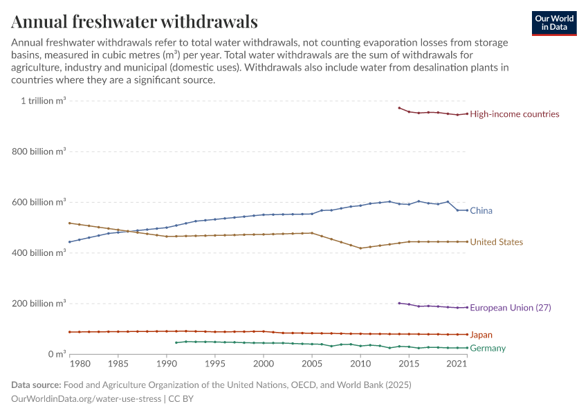 “Data Page: Annual freshwater withdrawals”. Our World in Data (2025). Data adapted from Food and Agriculture Organization of the United Nations, OECD, and World Bank. Retrieved from https://archive.ourworldindata.org/20250916-102301/grapher/annual-freshwater-withdrawals.html [online resource] (archived on September 16, 2025).How to cite this data
