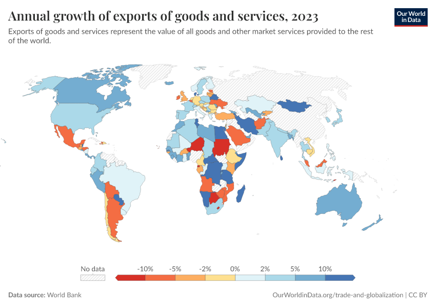 “Data Page: Annual growth of exports of goods and services”. Our World in Data (2026). Data adapted from World Bank. Retrieved from https://archive.ourworldindata.org/20251125-165536/grapher/annual-growth-of-exports-of-goods-and-services.html [online resource] (archived on November 25, 2025).How to cite this data