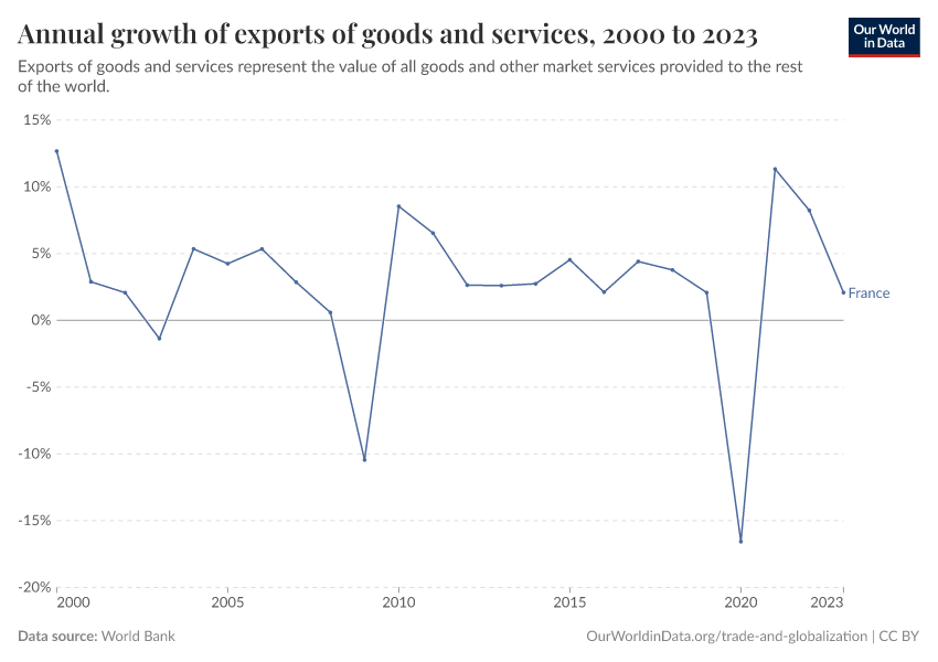 “Data Page: Annual growth of exports of goods and services”. Our World in Data (2025). Data adapted from World Bank. Retrieved from https://archive.ourworldindata.org/20251125-165536/grapher/annual-growth-of-exports-of-goods-and-services.html [online resource] (archived on November 25, 2025).How to cite this data