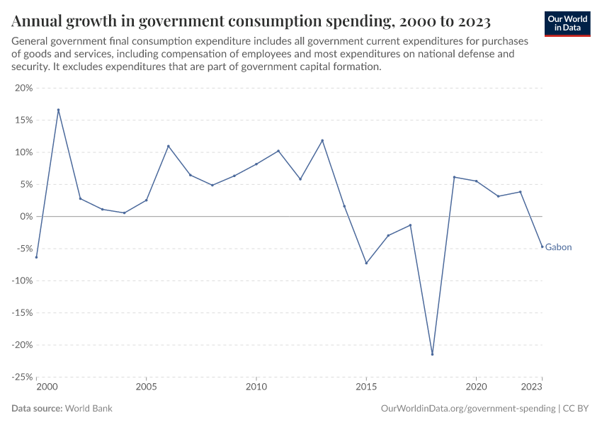 “Data Page: Annual growth in government consumption spending”. Our World in Data (2025). Data adapted from World Bank. Retrieved from https://archive.ourworldindata.org/20251125-165536/grapher/annual-growth-of-general-government-final-consumption-expenditure.html [online resource] (archived on November 25, 2025).