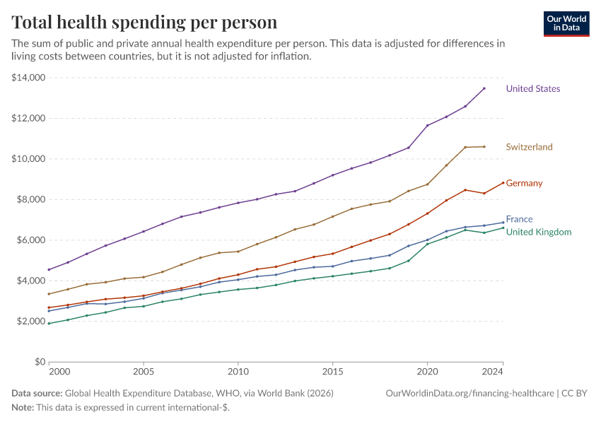 “Data Page: Total health spending per person”. Our World in Data (2026). Data adapted from Global Health Expenditure Database, WHO, via World Bank. Retrieved from https://archive.ourworldindata.org/20260304-094028/grapher/annual-healthcare-expenditure-per-capita.html [online resource] (archived on March 4, 2026).How to cite this data