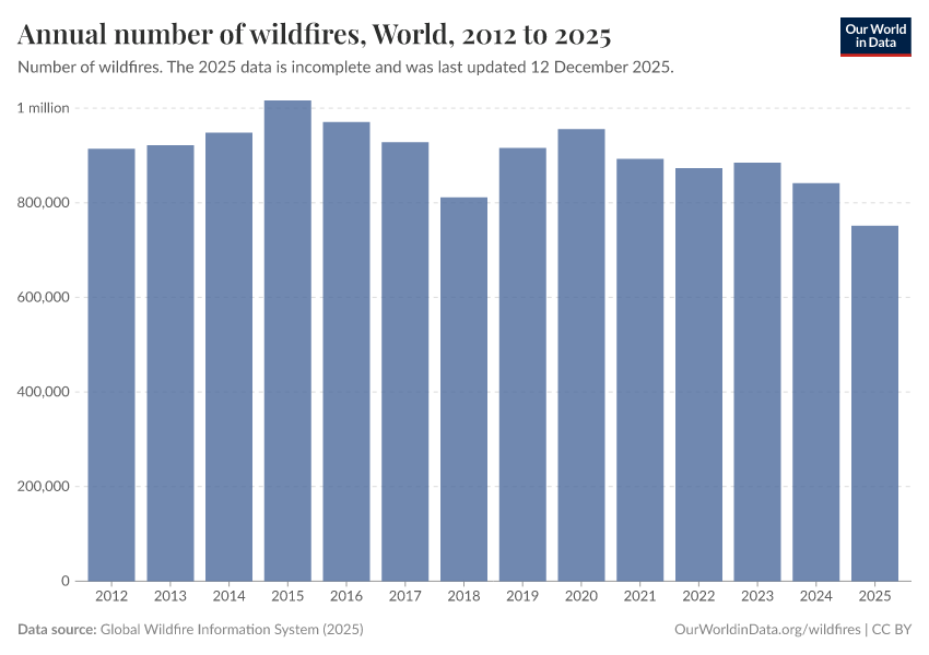 “Data Page: Annual number of wildfires”, part of the following publication: Hannah Ritchie, Pablo Rosado, and Veronika Samborska (2024) - “Climate Change”. Data adapted from Global Wildfire Information System. Retrieved from https://archive.ourworldindata.org/20251212-095432/grapher/annual-number-of-fires.html [online resource] (archived on December 12, 2025).How to cite this data
