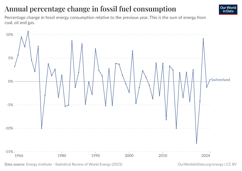 Energy Institute - Statistical Review of World Energy (2025) – with major processing by Our World in Data. “Annual percentage change in fossil fuel consumption” [dataset]. Energy Institute, “Statistical Review of World Energy” [original data]. Retrieved December 5, 2025 from https://archive.ourworldindata.org/20250909-093708/grapher/annual-percentage-change-fossil-fuels.html (archived on September 9, 2025).