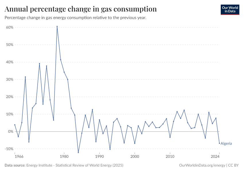 Energy Institute - Statistical Review of World Energy (2025) – with major processing by Our World in Data. “Annual percentage change in gas consumption” [dataset]. Energy Institute, “Statistical Review of World Energy” [original data]. Retrieved December 6, 2025 from https://archive.ourworldindata.org/20250909-093708/grapher/annual-percentage-change-gas.html (archived on September 9, 2025).