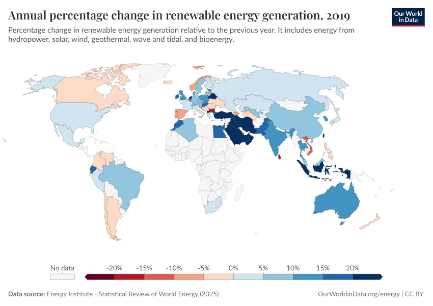 Energy Institute - Statistical Review of World Energy (2025) – with major processing by Our World in Data. “Annual percentage change in renewables consumption” [dataset]. Energy Institute, “Statistical Review of World Energy” [original data]. Retrieved January 11, 2026 from https://archive.ourworldindata.org/20250909-093708/grapher/annual-percentage-change-renewables.html (archived on September 9, 2025).
