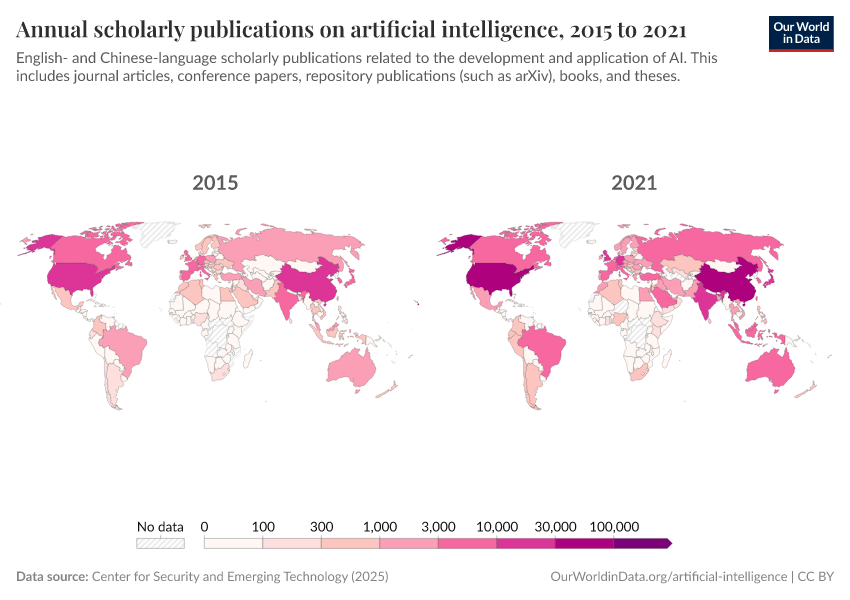 Center for Security and Emerging Technology (2025) – processed by Our World in Data. “Scholarly publications in artificial intelligence” [dataset]. Center for Security and Emerging Technology, “Country Activity Tracker: Artificial Intelligence” [original data]. Retrieved December 15, 2025 from https://archive.ourworldindata.org/20251114-100207/grapher/annual-scholarly-publications-on-artificial-intelligence.html (archived on November 14, 2025).