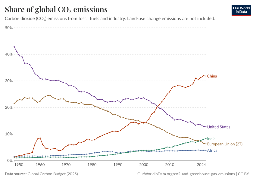 Global Carbon Budget (2025) – with major processing by Our World in Data. “Share of global CO₂ emissions” [dataset]. Global Carbon Project, “Global Carbon Budget v15” [original data]. Retrieved January 16, 2026 from https://archive.ourworldindata.org/20251204-133459/grapher/annual-share-of-co2-emissions.html (archived on December 4, 2025).