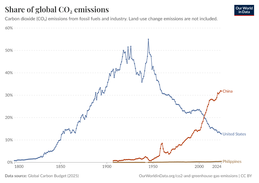 “Data Page: Share of global CO₂ emissions”, part of the following publication: Hannah Ritchie, Pablo Rosado, and Max Roser (2023) - “CO₂ and Greenhouse Gas Emissions”. Data adapted from Global Carbon Project. Retrieved from https://archive.ourworldindata.org/20251204-133459/grapher/annual-share-of-co2-emissions.html [online resource] (archived on December 4, 2025).How to cite this data