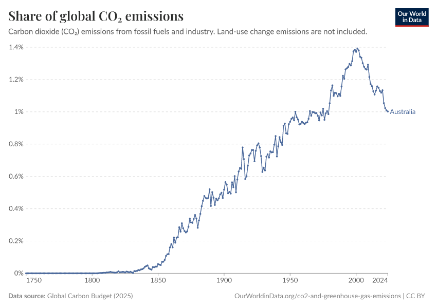 “Data Page: Share of global CO₂ emissions”, part of the following publication: Hannah Ritchie, Pablo Rosado, and Max Roser (2023) - “CO₂ and Greenhouse Gas Emissions”. Data adapted from Global Carbon Project. Retrieved from https://archive.ourworldindata.org/20251204-133459/grapher/annual-share-of-co2-emissions.html [online resource] (archived on December 4, 2025).