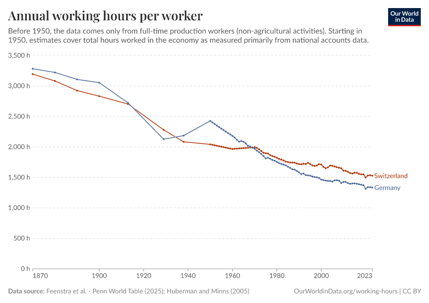 Feenstra et al. - Penn World Table (2025); Huberman and Minns (2005) – with major processing by Our World in Data. “Annual working hours per worker – Huberman and Minns, Penn World Table” [dataset]. Feenstra et al., “Penn World Table 11.0”; Huberman and Minns, “Working hours (Huberman and Minns, 2005)” [original data]. Retrieved December 7, 2025 from https://archive.ourworldindata.org/20251013-111729/grapher/annual-working-hours-per-worker.html (archived on October 13, 2025).