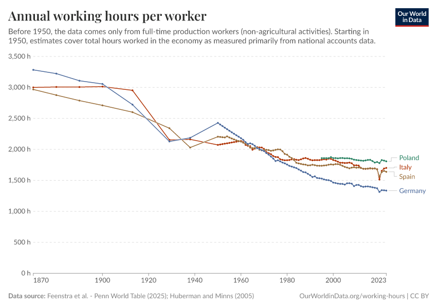 Feenstra et al. - Penn World Table (2025); Huberman and Minns (2005) – with major processing by Our World in Data. “Annual working hours per worker – Huberman and Minns, Penn World Table” [dataset]. Feenstra et al., “Penn World Table 11.0”; Huberman and Minns, “Working hours (Huberman and Minns, 2005)” [original data]. Retrieved December 14, 2025 from https://archive.ourworldindata.org/20251013-111729/grapher/annual-working-hours-per-worker.html (archived on October 13, 2025).