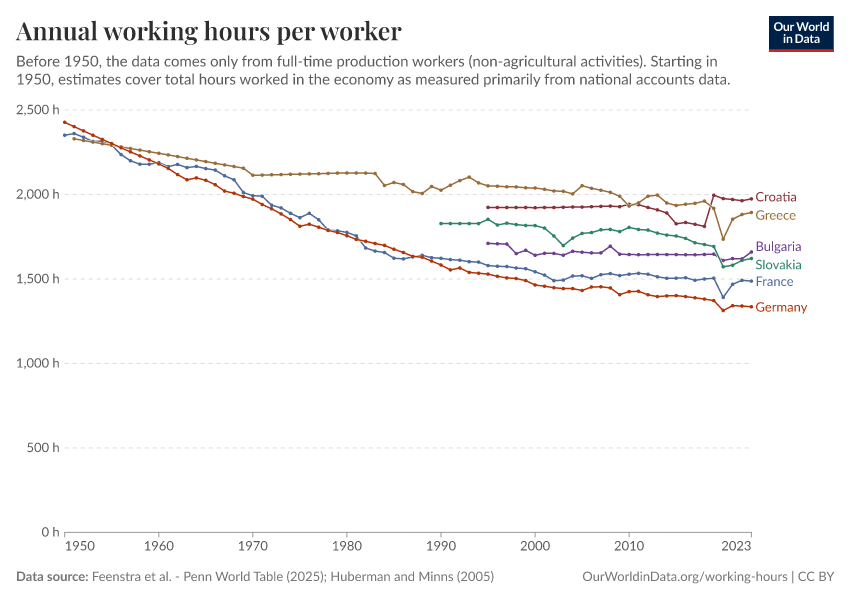 Feenstra et al. - Penn World Table (2025); Huberman and Minns (2005) – with major processing by Our World in Data. “Annual working hours per worker – Huberman and Minns, Penn World Table” [dataset]. Feenstra et al., “Penn World Table 11.0”; Huberman and Minns, “Working hours (Huberman and Minns, 2005)” [original data]. Retrieved January 10, 2026 from https://archive.ourworldindata.org/20251013-111729/grapher/annual-working-hours-per-worker.html (archived on October 13, 2025).
