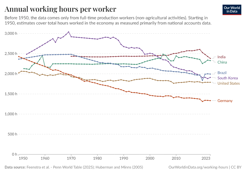 Feenstra et al. - Penn World Table (2025); Huberman and Minns (2005) – with major processing by Our World in Data. “Annual working hours per worker – Huberman and Minns, Penn World Table” [dataset]. Feenstra et al., “Penn World Table 11.0”; Huberman and Minns, “Working hours (Huberman and Minns, 2005)” [original data]. Retrieved December 27, 2025 from https://archive.ourworldindata.org/20251013-111729/grapher/annual-working-hours-per-worker.html (archived on October 13, 2025).