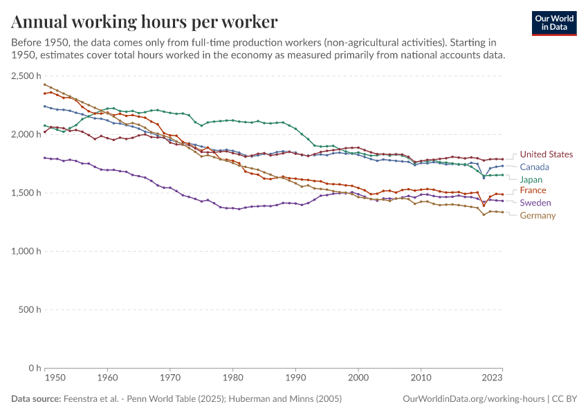 Feenstra et al. - Penn World Table (2025); Huberman and Minns (2005) – with major processing by Our World in Data. “Annual working hours per worker – Huberman and Minns, Penn World Table” [dataset]. Feenstra et al., “Penn World Table 11.0”; Huberman and Minns, “Working hours (Huberman and Minns, 2005)” [original data]. Retrieved January 13, 2026 from https://archive.ourworldindata.org/20251013-111729/grapher/annual-working-hours-per-worker.html (archived on October 13, 2025).