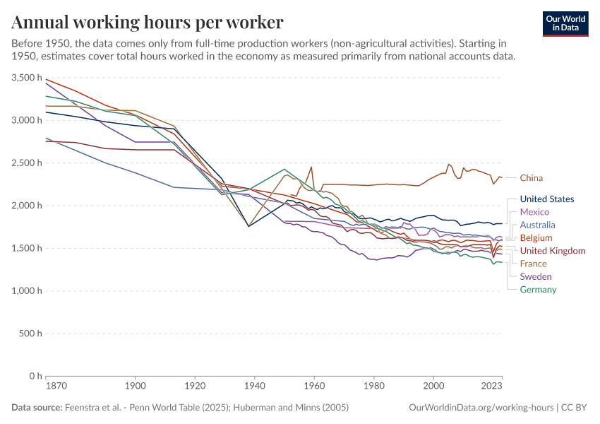 Feenstra et al. - Penn World Table (2025); Huberman and Minns (2005) – with major processing by Our World in Data. “Annual working hours per worker – Huberman and Minns, Penn World Table” [dataset]. Feenstra et al., “Penn World Table 11.0”; Huberman and Minns, “Working hours (Huberman and Minns, 2005)” [original data]. Retrieved April 17, 2026 from https://archive.ourworldindata.org/20260304-094028/grapher/annual-working-hours-per-worker.html (archived on March 4, 2026).Download
