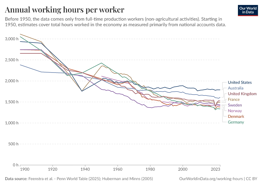 Feenstra et al. - Penn World Table (2025); Huberman and Minns (2005) – with major processing by Our World in Data. “Annual working hours per worker – Huberman and Minns, Penn World Table” [dataset]. Feenstra et al., “Penn World Table 11.0”; Huberman and Minns, “Working hours (Huberman and Minns, 2005)” [original data]. Retrieved March 18, 2026 from https://archive.ourworldindata.org/20260304-094028/grapher/annual-working-hours-per-worker.html (archived on March 4, 2026).