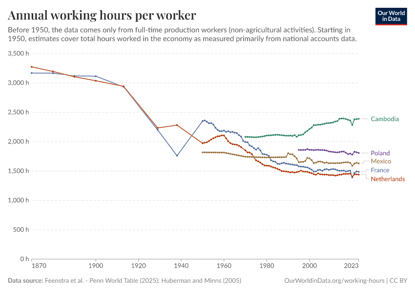 Feenstra et al. - Penn World Table (2025); Huberman and Minns (2005) – with major processing by Our World in Data. “Annual working hours per worker – Huberman and Minns, Penn World Table” [dataset]. Feenstra et al., “Penn World Table 11.0”; Huberman and Minns, “Working hours (Huberman and Minns, 2005)” [original data]. Retrieved December 6, 2025 from https://archive.ourworldindata.org/20251013-111729/grapher/annual-working-hours-per-worker.html (archived on October 13, 2025).