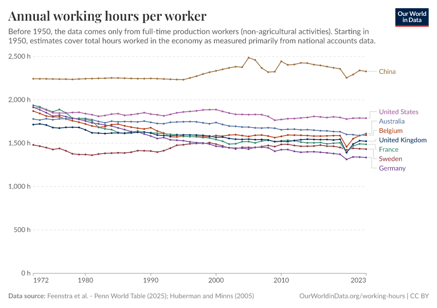 Feenstra et al. - Penn World Table (2025); Huberman and Minns (2005) – with major processing by Our World in Data. “Annual working hours per worker – Huberman and Minns, Penn World Table” [dataset]. Feenstra et al., “Penn World Table 11.0”; Huberman and Minns, “Working hours (Huberman and Minns, 2005)” [original data]. Retrieved December 20, 2025 from https://archive.ourworldindata.org/20251013-111729/grapher/annual-working-hours-per-worker.html (archived on October 13, 2025).