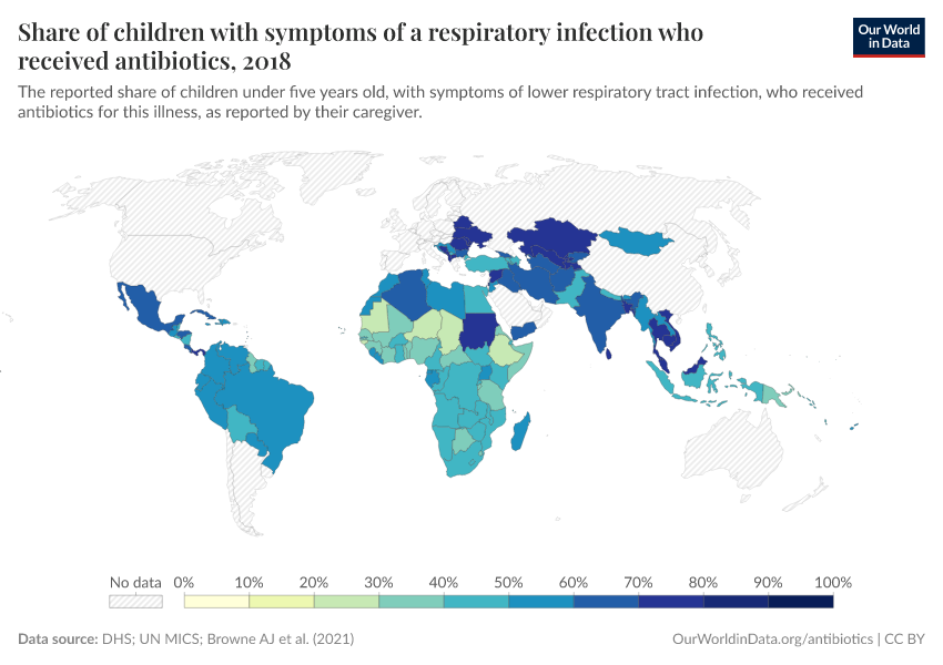 “Data Page: Share of children with symptoms of a respiratory infection who received antibiotics”, part of the following publication: Saloni Dattani, Fiona Spooner, Hannah Ritchie, and Max Roser (2024) - “Antibiotics and Antibiotic Resistance”. Data adapted from Browne AJ et al.. Retrieved from https://archive.ourworldindata.org/20250909-093708/grapher/antibiotic-usage-in-children.html [online resource] (archived on September 9, 2025).