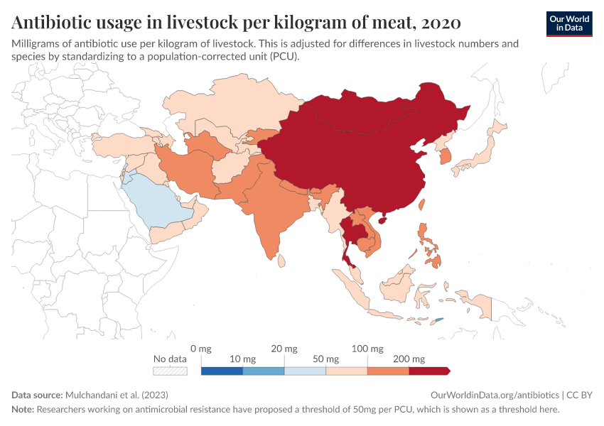 “Data Page: Antibiotic usage in livestock per kilogram of meat”. Our World in Data (2026). Data adapted from Mulchandani et al.. Retrieved from https://archive.ourworldindata.org/20250909-093708/grapher/antibiotic-usage-in-livestock.html [online resource] (archived on September 9, 2025).How to cite this data