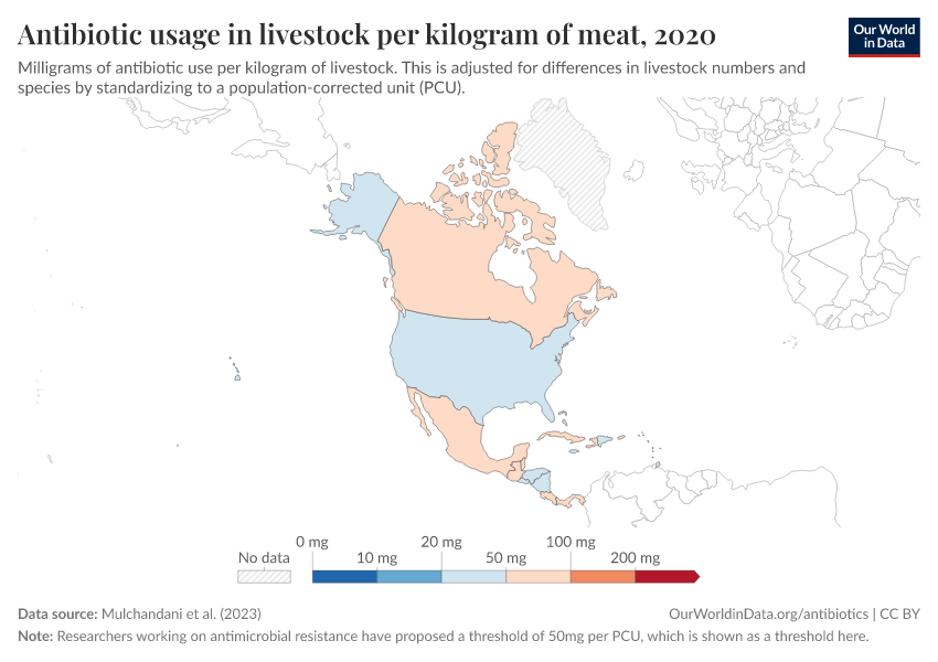 “Data Page: Antibiotic usage in livestock per kilogram of meat”. Our World in Data (2026). Data adapted from Mulchandani et al.. Retrieved from https://archive.ourworldindata.org/20250909-093708/grapher/antibiotic-usage-in-livestock.html [online resource] (archived on September 9, 2025).How to cite this data