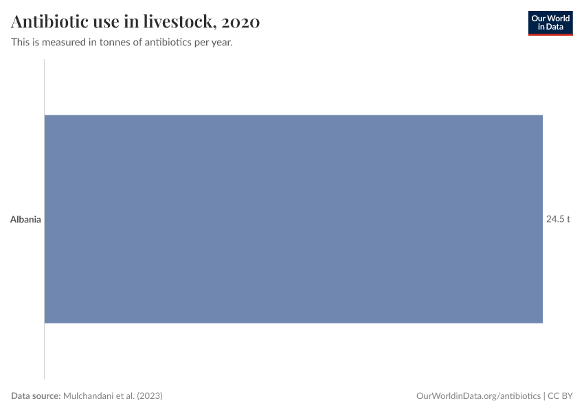 “Data Page: Antibiotic use in livestock”. Our World in Data (2025). Data adapted from Mulchandani et al.. Retrieved from https://archive.ourworldindata.org/20250909-093708/grapher/antibiotic-use-livestock-tonnes.html [online resource] (archived on September 9, 2025).