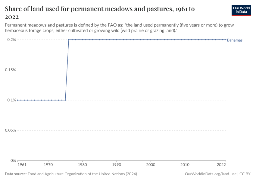 “Data Page: Share of land used for permanent meadows and pastures”, part of the following publication: Hannah Ritchie, Pablo Rosado, and Max Roser (2023) - “Agricultural Production”. Data adapted from Food and Agriculture Organization of the United Nations. Retrieved from https://archive.ourworldindata.org/20251014-161652/grapher/area-meadows-and-pastures.html [online resource] (archived on October 14, 2025).