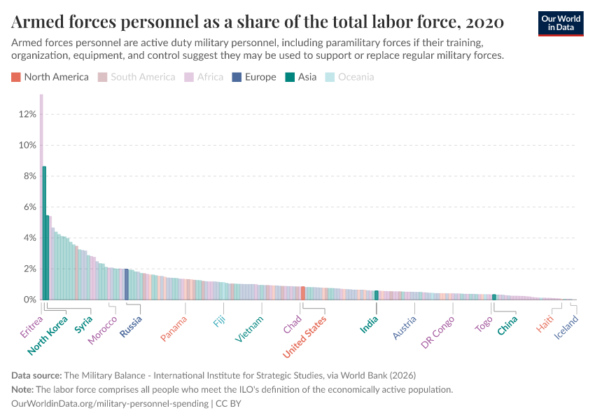 “Data Page: Armed forces personnel as a share of the total labor force”. Our World in Data (2026). Data adapted from The Military Balance - International Institute for Strategic Studies, via World Bank. Retrieved from https://archive.ourworldindata.org/20260325-171315/grapher/armed-forces-personnel-of-total-labor-force.html [online resource] (archived on March 25, 2026).How to cite this data