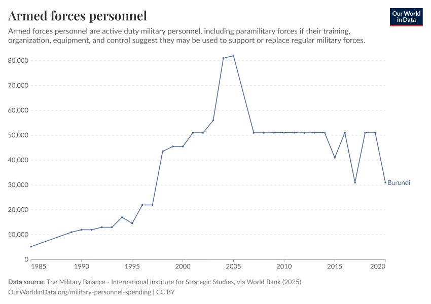 “Data Page: Armed forces personnel”. Our World in Data (2026). Data adapted from The Military Balance - International Institute for Strategic Studies, via World Bank. Retrieved from https://archive.ourworldindata.org/20260112-111535/grapher/armed-forces-personnel.html [online resource] (archived on January 12, 2026).How to cite this data