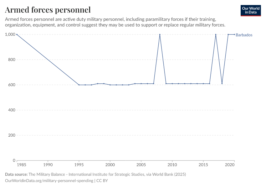 “Data Page: Armed forces personnel”. Our World in Data (2026). Data adapted from The Military Balance - International Institute for Strategic Studies, via World Bank. Retrieved from https://archive.ourworldindata.org/20251209-133038/grapher/armed-forces-personnel.html [online resource] (archived on December 9, 2025).How to cite this data