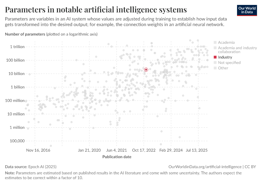 Epoch AI (2025) – with major processing by Our World in Data. “Parameters in notable artificial intelligence systems” [dataset]. Epoch AI, “Parameter, Compute and Data Trends in Machine Learning” [original data]. Retrieved February 7, 2026 from https://archive.ourworldindata.org/20260126-094752/grapher/artificial-intelligence-parameter-count.html (archived on January 26, 2026).