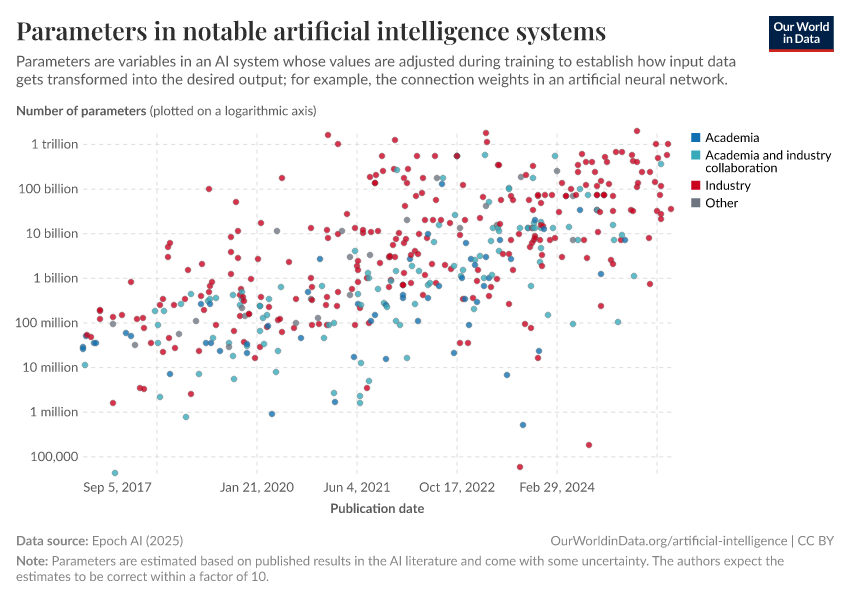 Epoch AI (2025) – with major processing by Our World in Data. “Parameters in notable artificial intelligence systems” [dataset]. Epoch AI, “Parameter, Compute and Data Trends in Machine Learning” [original data]. Retrieved December 5, 2025 from https://archive.ourworldindata.org/20251009-110947/grapher/artificial-intelligence-parameter-count.html (archived on October 9, 2025).