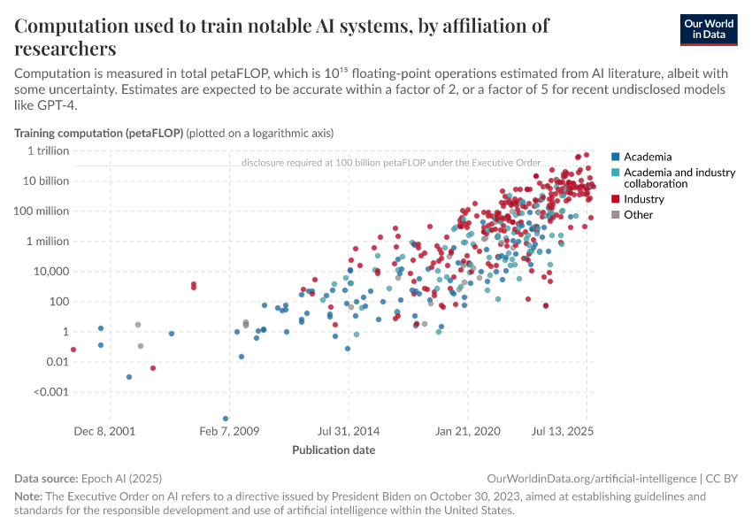 Epoch AI (2025) – with major processing by Our World in Data. “Computation used to train notable AI systems, by affiliation of researchers” [dataset]. Epoch AI, “Parameter, Compute and Data Trends in Machine Learning” [original data]. Retrieved December 16, 2025 from https://archive.ourworldindata.org/20251212-095432/grapher/artificial-intelligence-training-computation-by-researcher-affiliation.html (archived on December 12, 2025).