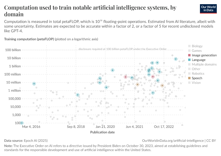 Epoch AI (2025) – with major processing by Our World in Data. “Computation used to train notable artificial intelligence systems, by domain” [dataset]. Epoch AI, “Parameter, Compute and Data Trends in Machine Learning” [original data]. Retrieved February 16, 2026 from https://archive.ourworldindata.org/20260126-094752/grapher/artificial-intelligence-training-computation.html (archived on January 26, 2026).