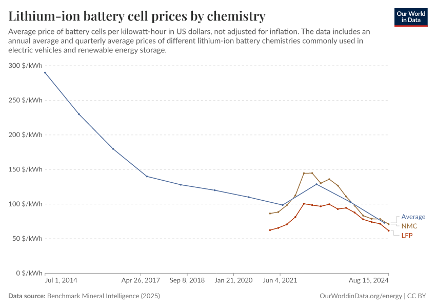 “Data Page: Lithium-ion battery cell prices by chemistry”, part of the following publication: Hannah Ritchie, Pablo Rosado, and Max Roser (2023) - “Energy”. Data adapted from Benchmark Mineral Intelligence. Retrieved from https://archive.ourworldindata.org/20260108-171008/grapher/average-battery-cell-price.html [online resource] (archived on January 8, 2026).How to cite this data