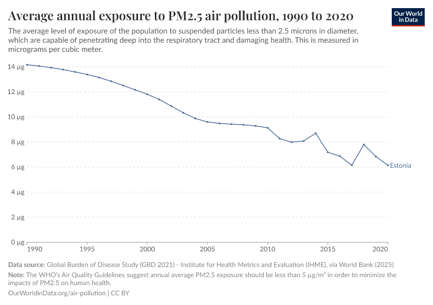 “Data Page: Average annual exposure to PM2.5 air pollution”. Our World in Data (2025). Data adapted from Global Burden of Disease Study (GBD 2021) - Institute for Health Metrics and Evaluation (IHME), via World Bank. Retrieved from https://archive.ourworldindata.org/20250916-103535/grapher/average-exposure-pm25-pollution.html [online resource] (archived on September 16, 2025).How to cite this data