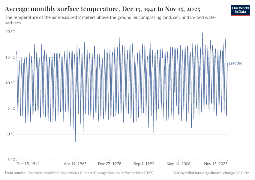 Contains modified Copernicus Climate Change Service information (2025) – with major processing by Our World in Data. “Average monthly surface temperature” [dataset]. Contains modified Copernicus Climate Change Service information, “ERA5 monthly averaged data on single levels from 1940 to present 2” [original data]. Retrieved December 14, 2025 from https://archive.ourworldindata.org/20251210-204518/grapher/average-monthly-surface-temperature.html (archived on December 10, 2025).