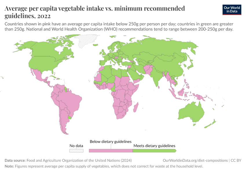 “Data Page: Yearly per capita supply of vegetables”. Our World in Data (2025). Data adapted from Food and Agriculture Organization of the United Nations. Retrieved from https://archive.ourworldindata.org/20251128-120039/grapher/average-per-capita-vegetable-intake-vs-minimum-recommended-guidelines.html [online resource] (archived on November 28, 2025).How to cite this data