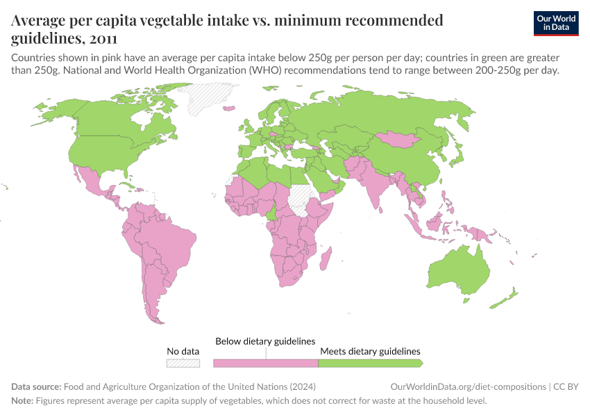 “Data Page: Yearly per capita supply of vegetables”. Our World in Data (2025). Data adapted from Food and Agriculture Organization of the United Nations. Retrieved from https://archive.ourworldindata.org/20251209-133038/grapher/average-per-capita-vegetable-intake-vs-minimum-recommended-guidelines.html [online resource] (archived on December 9, 2025).How to cite this data