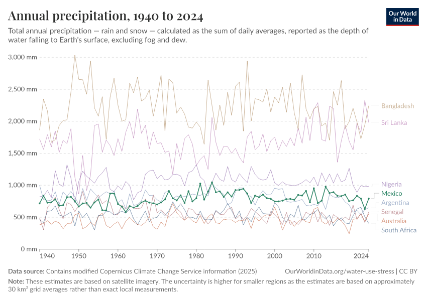 Contains modified Copernicus Climate Change Service information (2025) – with major processing by Our World in Data. “Annual precipitation” [dataset]. Contains modified Copernicus Climate Change Service information, “ERA5 monthly averaged data on single levels from 1940 to present 2” [original data]. Retrieved March 14, 2026 from https://archive.ourworldindata.org/20260304-094028/grapher/average-precipitation-per-year.html (archived on March 4, 2026).